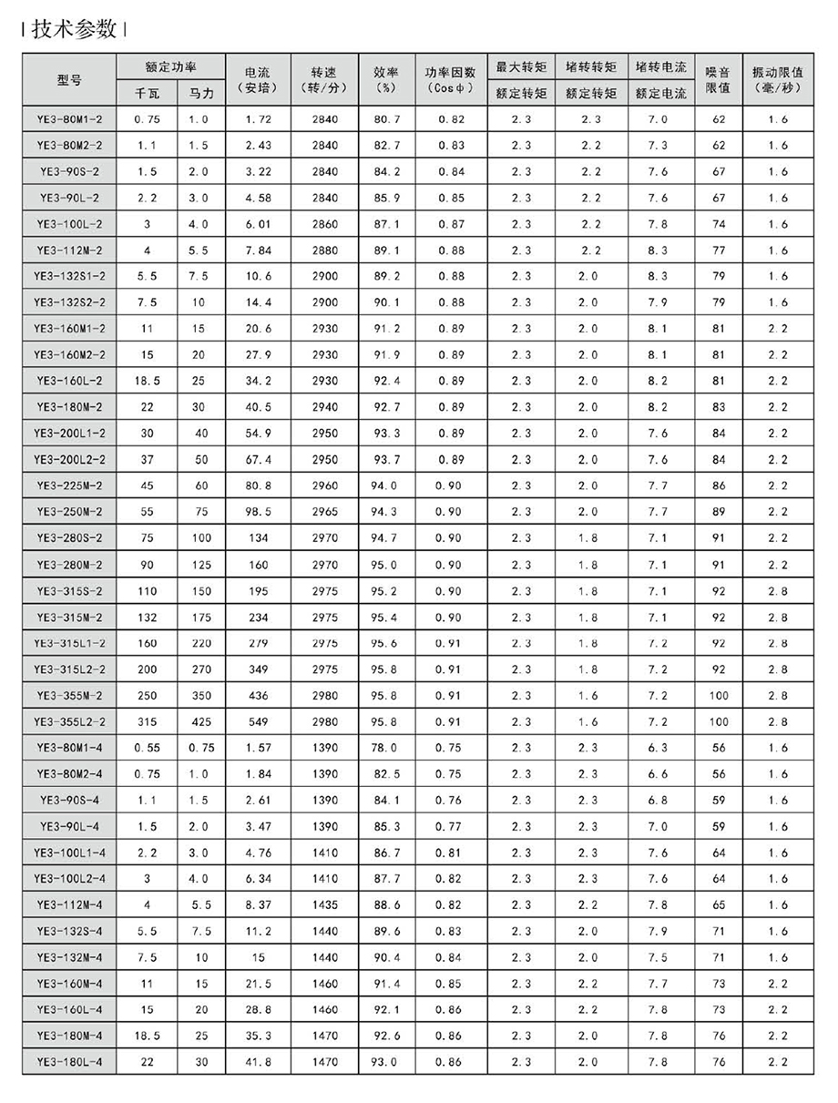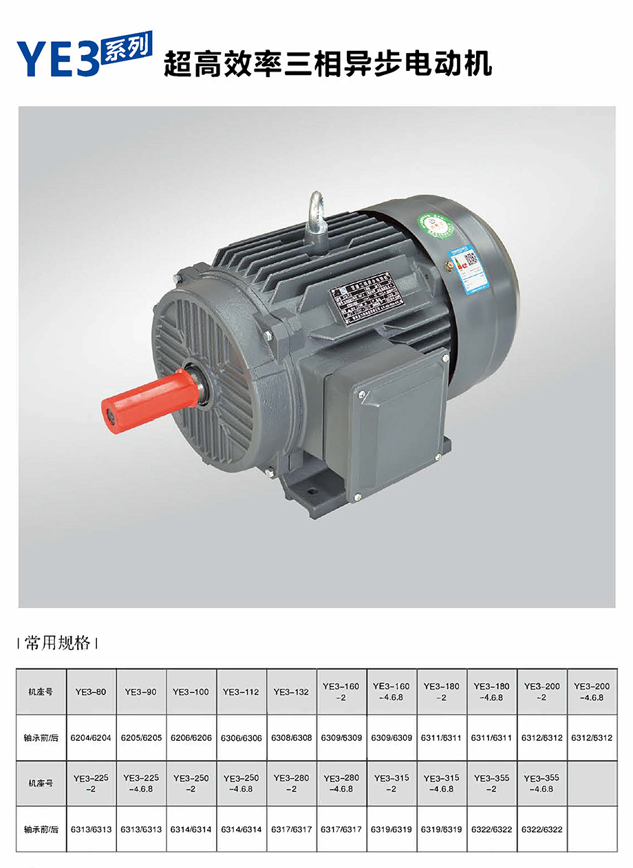 YE3系列超高效率三相異步電動機是國家推廣使用的超寄效節能產品。 我公司生產的YE3系列(IP55)高效率三相異步電動機(機座號80 ~ 355)是達到能效限定值的低壓全封閉自扇冷式超高效率訊籠三相異步電動機,其效率值完全達到GB18613-2020 《電動機能效限定值及能效等級》中的能效3級要求, 與國際標準 IEC60034-30中IE3保持 一 致。 該系列產品整機結構緊湊, 外形美觀大方, 具有高效、 節能、 性能好、 振動小、 噪聲低、 壽命長 、 可靠性高、 起動轉矩大 、 使用維護方便等特點。廣泛應用干一般無特殊要求的機械設備, 如農業機械、 食品機械、 風機、 水泵、 機床、 攪拌機、 空氣壓縮機等。