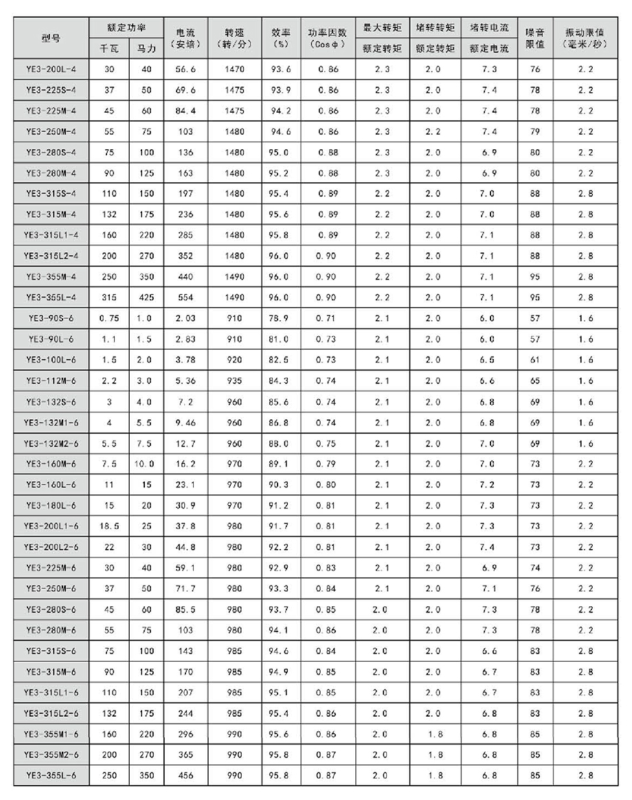 電動機的額定電壓380V, 額定顏率50HZ, 功率范圍0.75- 375KW。 功率在3KW以下者為Y接法, 其它功率均為A接法。 電動機符合GB/T28575-2012《YE3系列(IP55)超窩效率三相異步電動機技術條件(機座號80 ~ 355)》的要求。