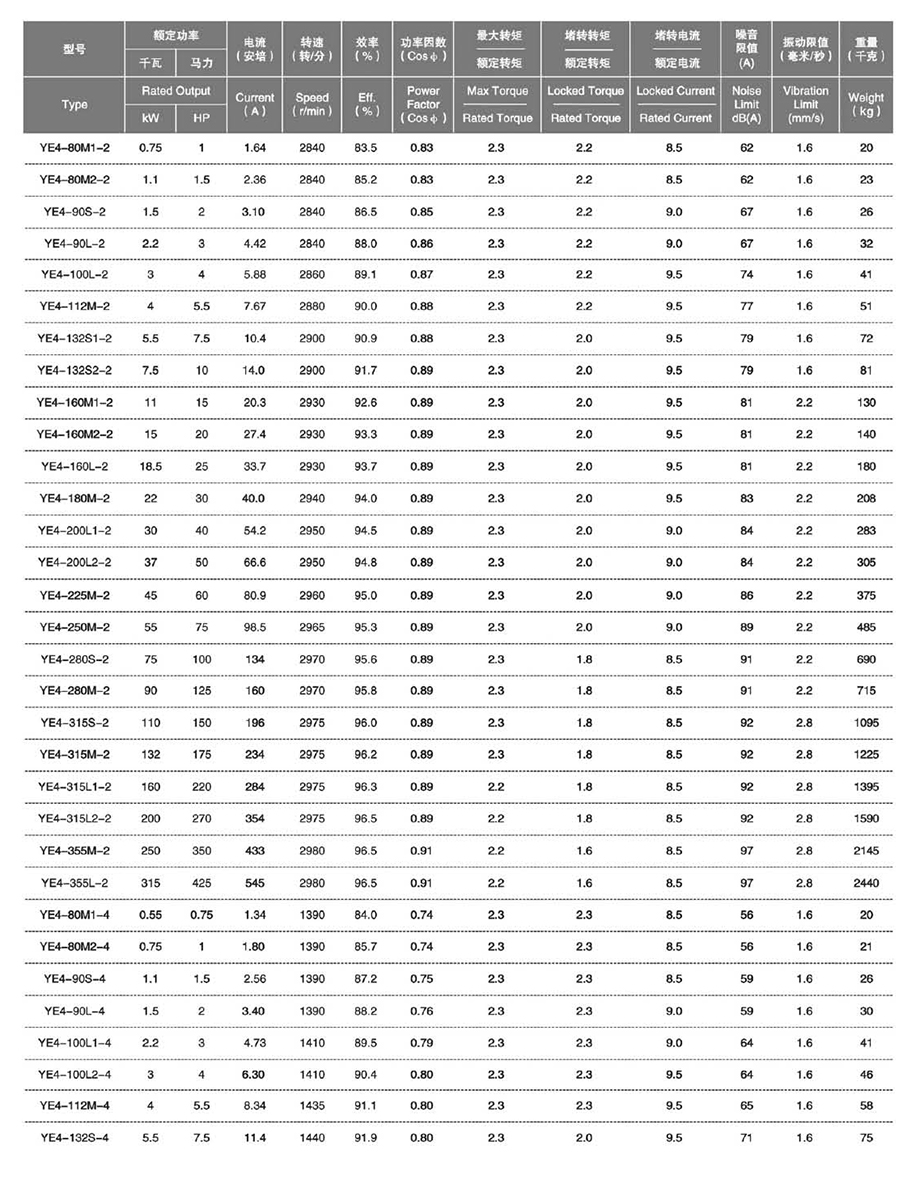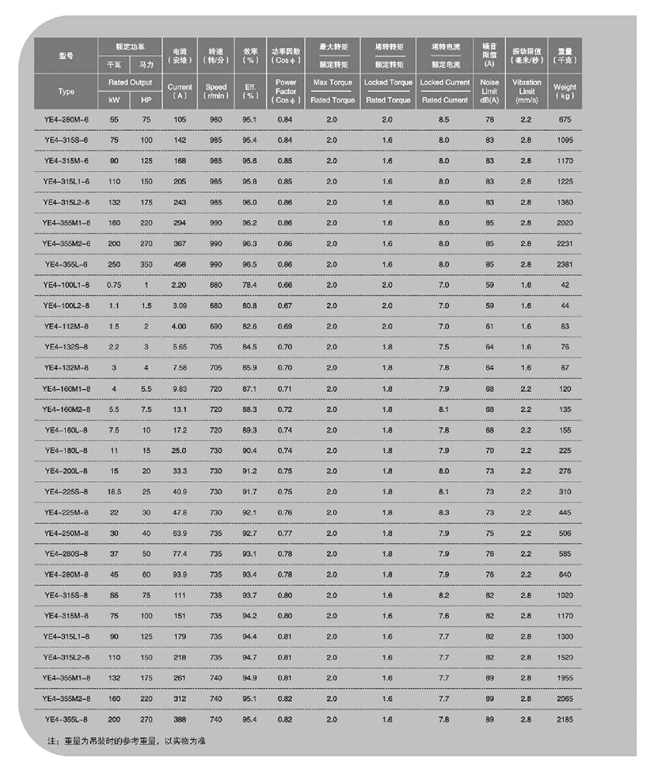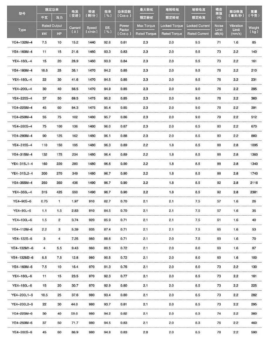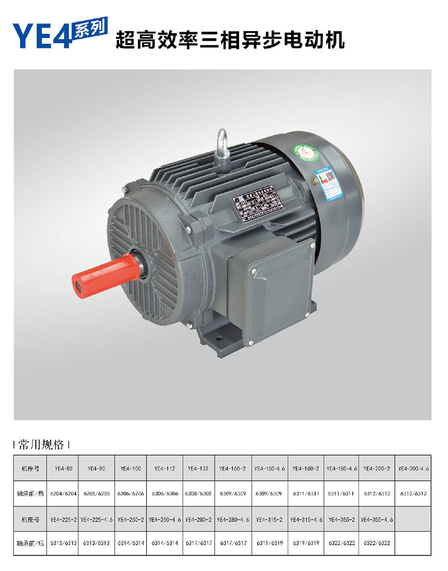 我公司YE4系列三相異步電動機,執行JB/T13299-2017《YE4系列(IP55)三相異步電動機技術條件(機座號80-450)》標準,其效率指標與IEC60034中的(IE4)保持一致。該系列電動機是高效節