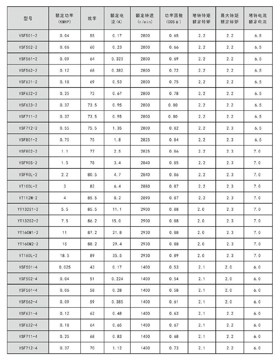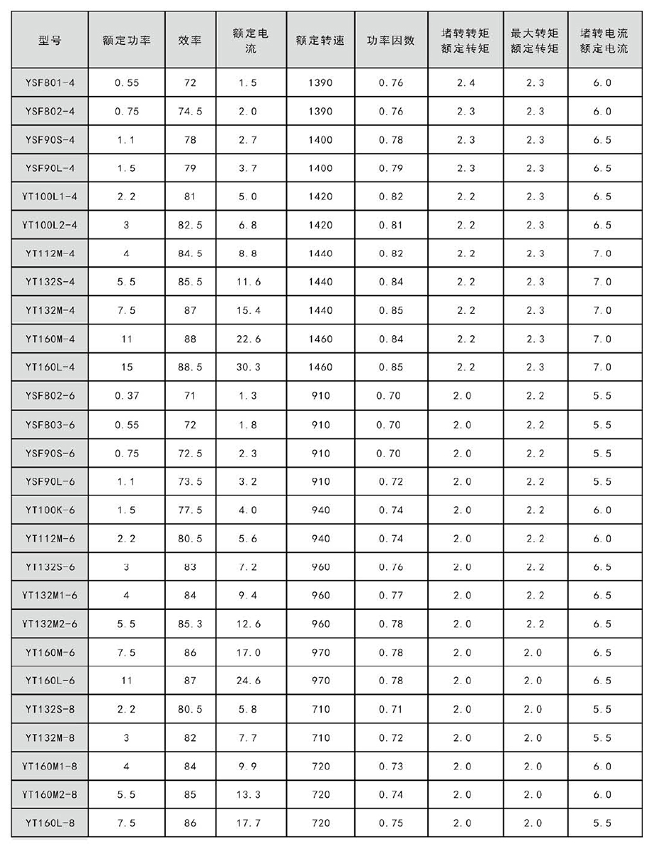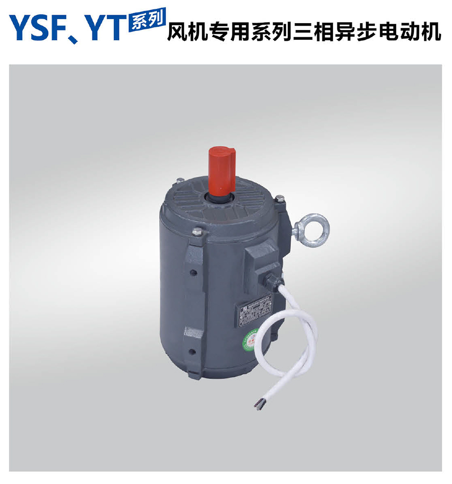 YSF、YT風(fēng)機(jī)專用系列三相異步電動(dòng)機(jī)是根據(jù)風(fēng)機(jī)行業(yè)的配套要求,電動(dòng)機(jī)在結(jié)構(gòu)上采取了一系列的降噪、減振措施。該系列電動(dòng)機(jī)具有高效節(jié)能、噪聲低、振動(dòng)小,起動(dòng)性能好、運(yùn)行可靠、使用安裝方便等特點(diǎn)。額定電壓380V,頻率為50HZ,也可按用戶要求制成其它電壓和頻率。防護(hù)等級(jí)為IP44,絕緣等級(jí)為B級(jí),也可制成F級(jí),工作方式為S1。